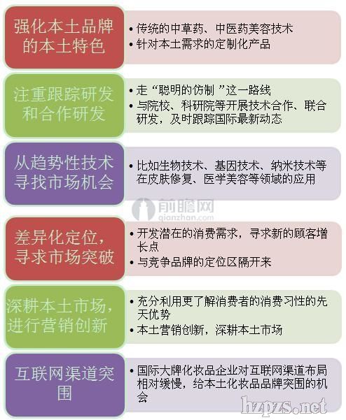 本土品牌如何突围? 在遭遇外资品牌的巨大压力下,本土企业该如何突围,成为业内探讨的焦点,前瞻产业研究院认为,强化本土品牌的本土特色、注重跟踪研发和合作研发、从趋势性技术寻找市场机会、差异化定位寻求市场突破、深耕本土市场进行营销创新、互联网渠道突围。。。。。。等等方式均是可以尝试挖掘的方式,只有从产品、研发、营销、渠道等多角度进行优化,才有可能在外资当道的化妆品市场取得一席之地。 图表3:本土化妆品品牌突围之道