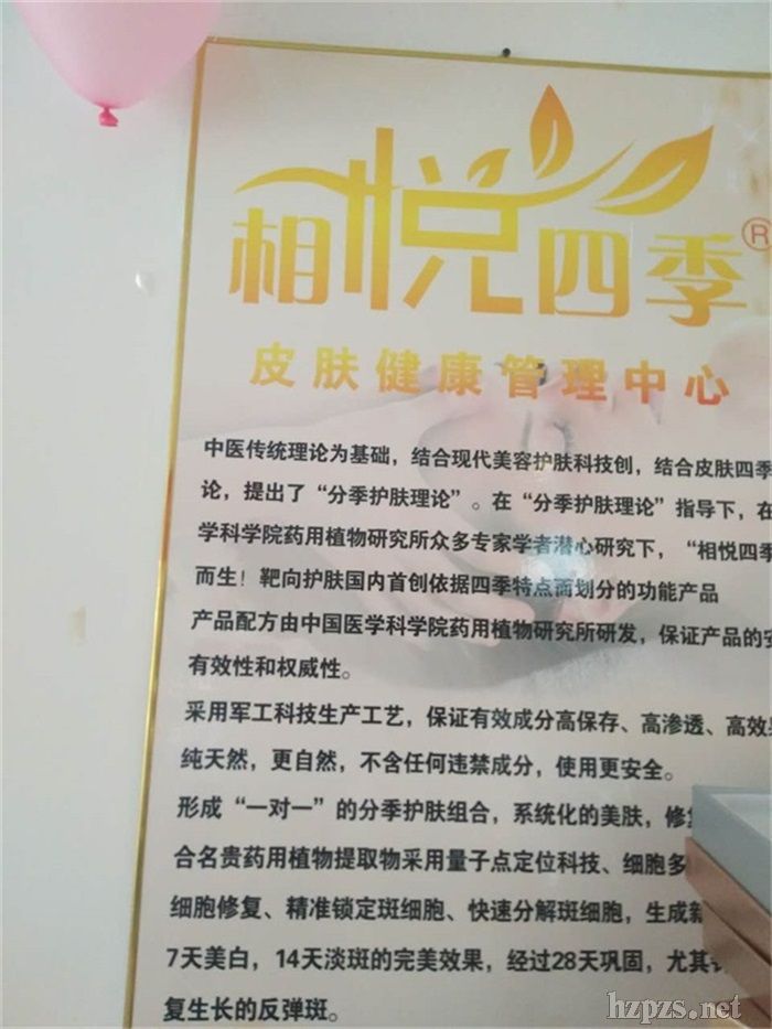 相悦四季美容院连锁加盟品牌,成立于2000年,一直致力于面部问题肌肤的调理与解决,发展18年以来,受到了来自各界的加盟商的好评。该品牌十八年来一直致力面部问题皮肤的治疗与护理,以中草药配方为主打,目前拥有近300款专业线产品,涵盖了治疗、营养和护理领导的全线产品,包括各类黄褐斑、色斑、雀斑、美白祛黄、青春痘、黑头、祛皱等中医中药系列产品,有内服和外用两套体系。选择加盟相悦四季,不仅可以拿到一手货源,同时还能享受到品牌总部的免费加盟扶持,相悦四季,帮你轻松开好美容院。