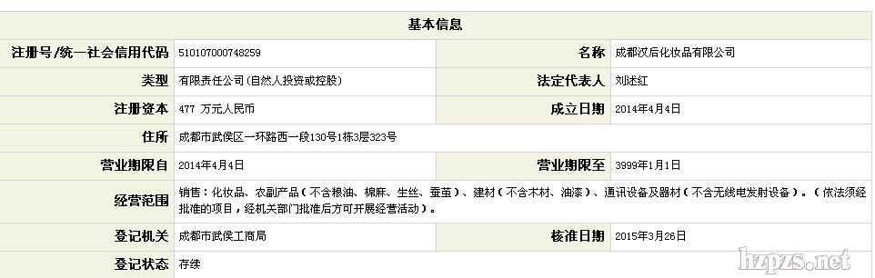 成都汉后化妆品有限公司 招商部 地 址: 成都市武侯区临江东路36号锦江花园城钻石座20F