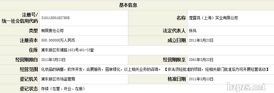 滢露鸿(上海)实业有限公司 张凤 女士 地 址: 松江区 新桥镇九新公路2888号1号楼6楼A座