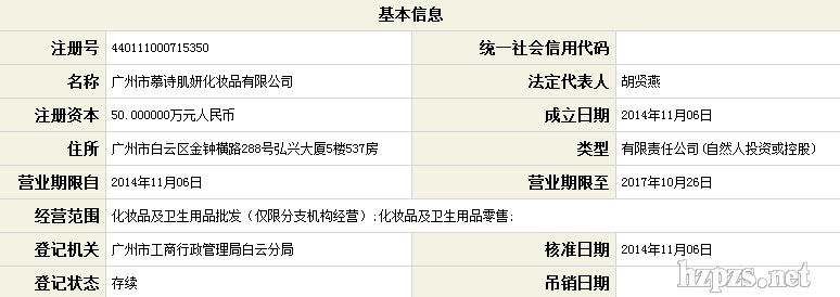 广州市慕诗肌妍化妆品有限公司 胡贤燕 女士 地 址: 白云区 金钟横路
