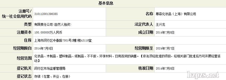 慕森化妝品(上海)有限公司 慕森 地 址: 上海奉贤区虹化路166号
