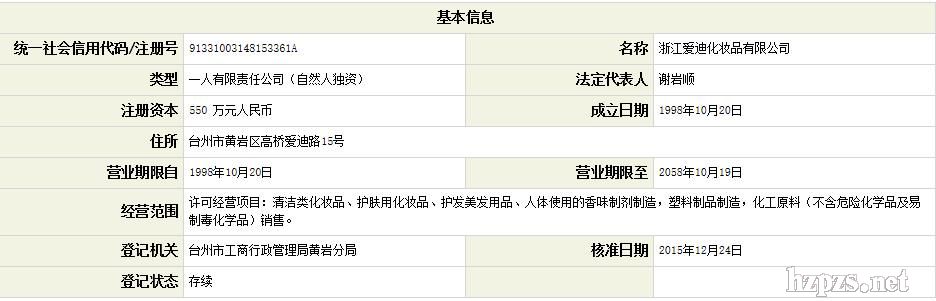 浙江爱迪化妆品有限公司 爱迪 地 址: 浙江省台州市黄岩区高桥爱迪路15号