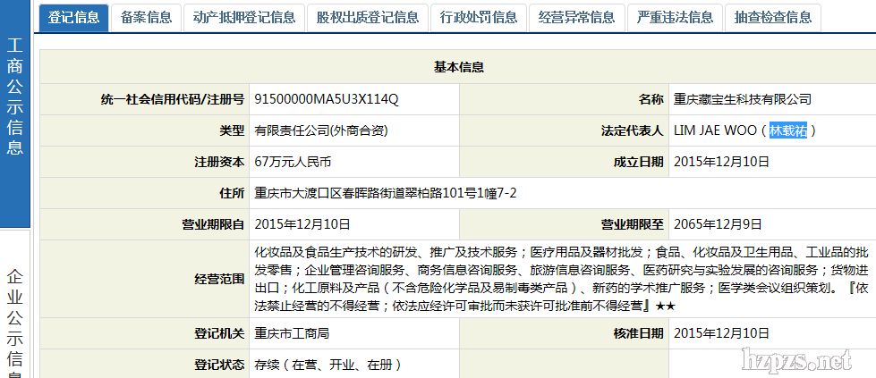 重庆藏宝生科技有限公司 林载祐 地 址: 春晖路街道翠柏路101号7号楼13室