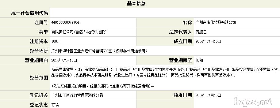 广州岸尚化妆品有限公司 石振江 地 址: 海珠区工业大道97号