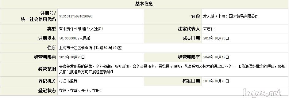 发无域(上海)国际贸易有限公司 宋志仁 地 址: 徐汇区吴中路39号新概念大厦307-308室