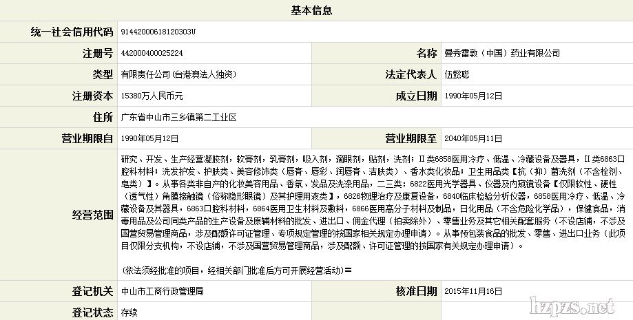 曼秀雷敦(中国)药业有限公司 曲红波 地 址: 广州市天河区河北路233号
