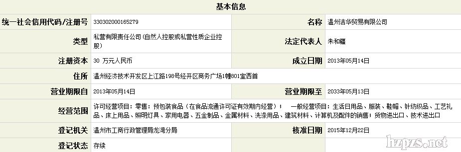 温州洁华贸易有限公司 朱伟乾 地 址: 浙江经济技术开发区上江路198号经开区商务广场1幢