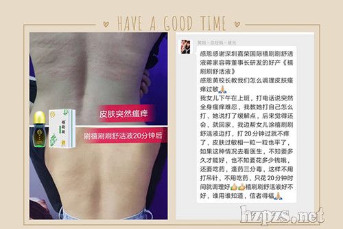 我女儿下午在上班,打电话说突然全身瘙痒难忍,我教她打自己怎么打,她说打了缓解点,后来觉得还会,就回家,我边帮女儿涂禧刷刷舒活液边打,打20分钟过就不痒了,皮肤过敏相一粒一粒也平了,如果这种情况去看医生,不知要多久才能好,也不知要花多少钱哦,还要吃药,逢药三分毒,这样不用打吊针,不用吃药,只花20分钟时间就调理好禧刷刷舒活液好不好,谁用谁知道,信者得福!