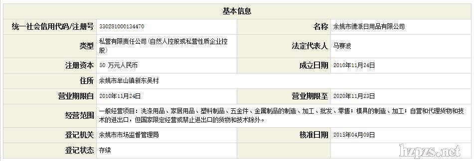 余姚市德派日用品有限公司 杨俊 地 址: 浙江 余姚市 牟山镇新东吴村