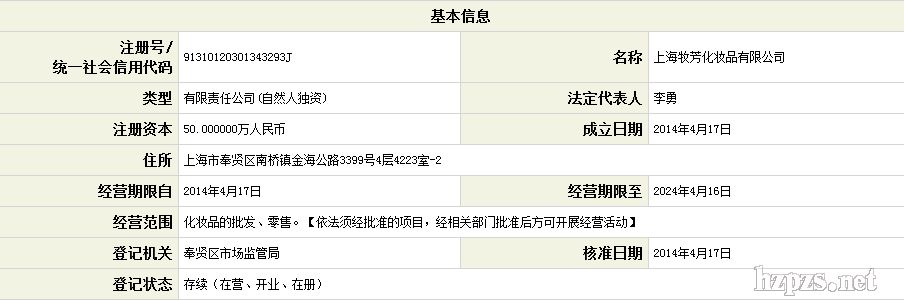 上海牧芳化妆品有限公司 牧芳化妆品 地 址: 上海市奉贤区南桥镇金海公路3399号4层4223室