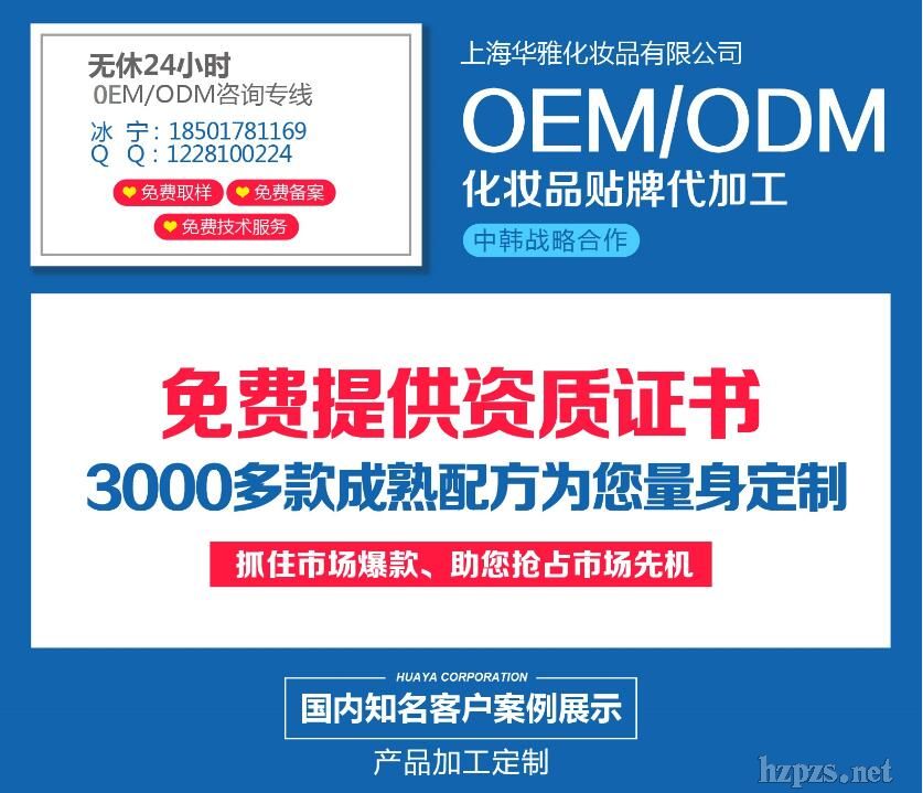| 华雅可提供服务: 按照客户需求和市场定位免费打样和技术咨询; 提供三证及条形码; 协助客户产品上市前的备案和送检; 协助客户调整品牌的架构和新品开发方向; 协助客户注册公司及商标等; 提供仓储、货运管理服务; 另可提供有偿其他项目服务,详细咨询OEM部门。 华雅OEM/ODM加工实力 1、专业的团队:有着高素质、专业知识、稳定成熟的员工队伍,敬业的领导群; 2、专业的研发:拥有高尖国内及韩国的专业技术人员,十几位工程师人员以确保其产品与国际接轨; 3、专业的信息:前延的国内外市场信息和品牌影响力,为合作者提供了切入市场的高起点平台; 4、专业的货源:华雅公司特有的全过程采购跟踪和庞大的原料及包装供应商网络,为客户节省了大量的有效资源; 5、专业的策划:高、中、低档不同客户需求订做不同产品,只需说明对品牌和产品的要求即可; 6、专业的管理:严谨的产品质量管理体系,确保所生产的每一件产品的质量稳定; 7、专业的服务:协助客户注册商标,进行产品备案及检验;代为订包装材料及验收包材,并积极跟进客户的产品销售反馈意见; 8、专业的厂房:拥有高性能生产管理和生产设备。 |